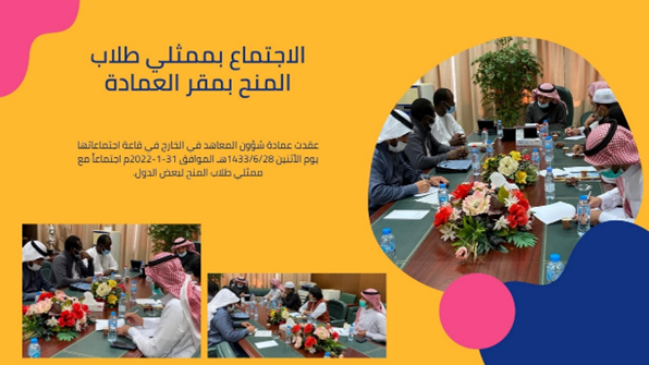 The reception and visit were attended and the meeting was attended by His Excellency the Dean of Admission and Registration Affairs, Dr. Suleiman Al-Anqari, His Excellency the Dean of the Institute of Arabic Language Teaching, Dr. Badr Al-Abdulqader, the Vice Dean for Scholarship Affairs, Dr. Assem Al Hamad, the Scholarship Program Supervisor, Mr. Faisal Al-Qahtani, a representative from the Deanship of Graduate Studies, directors of departments and heads of departments at the Grants Agency. The scholarship program and supervisor of the Ministry of Education, Mr. Faisal Al-Qahtani.