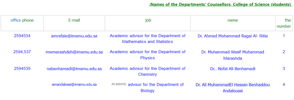 The Deanship has identified each group of students of the educational unit as their own guide among the faculty members and made his name at the top of the student's schedule so that he can contact him and consult with him in resolving the problems that he may encounter in his academic career, and takes his hand to what is good and his interest and has defined him terms of reference including: