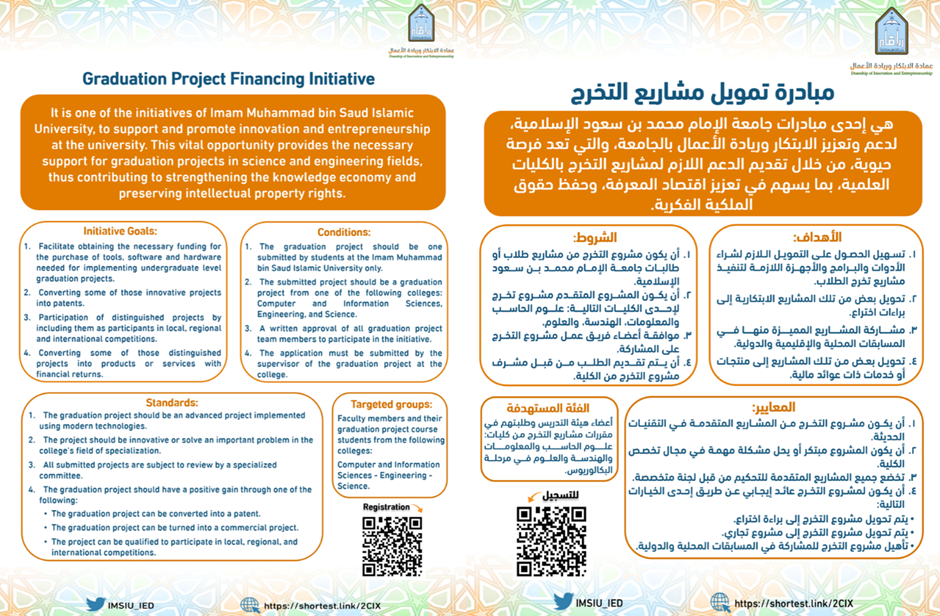 It is one of the initiatives of Imam Muhammad bin Saud Islamic University, to support and promote innovation and entrepreneurship at the university. This vital opportunity provides the necessary support for graduation projects in science and engineering fields, thus contributing to strengthening the knowledge economy and preserving intellectual property rights.​