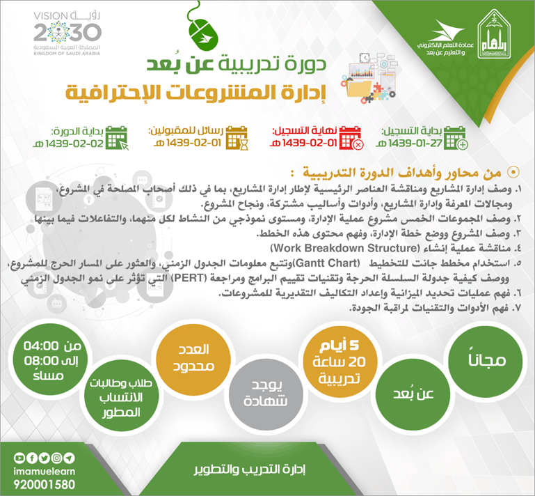 The deanship of e-learning and distance education, represented by the department of training and development, intends to hold a remote training course called :(management of professional projects) for students of advanced affiliation.