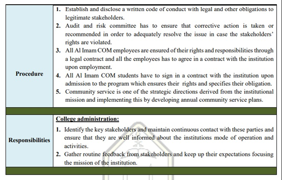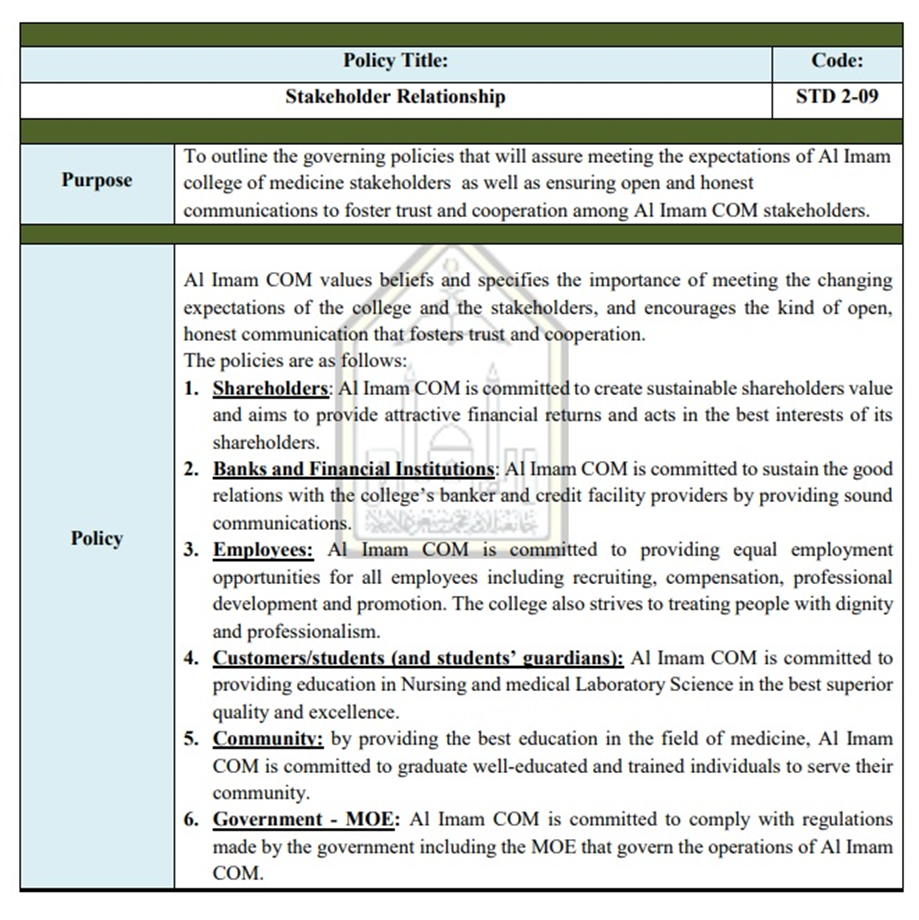 Purpose To outline the governing policies that will assure meeting the expectations of Al Imam college of medicine stakeholders as well as ensuring open and honest communications to foster trust and cooperation among Al Imam COM stakeholders. Policy Al Imam COM values beliefs and specifies the importance of meeting the changing expectations of the college and the stakeholders, and encourages the kind of open, honest communication that fosters trust and cooperation. The policies are as follows:Â