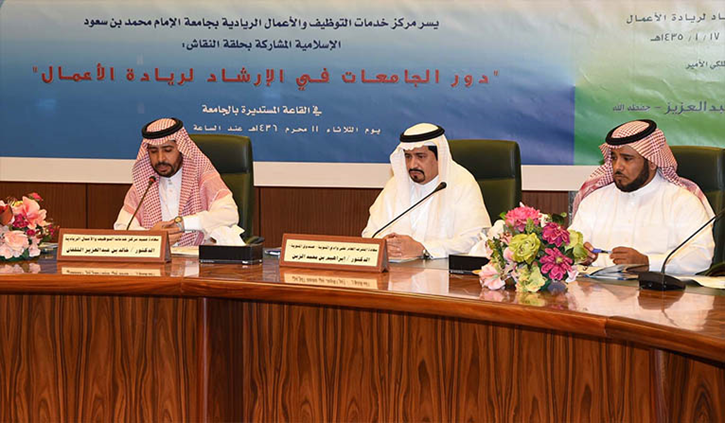 In coincidence with the global week of guiding for entrepreneurship under the kind patronage of H.R.H. Prince Abdulaziz bin Abdullah bin Abdulaziz, Al-Imam Muhammad Ibn Saud Islamic University Centre for Business Career and Entrepreneurship “CBCE” has launched a penal of discussion entitled “Role of Universities in Backing Guidance of Entrepreneurship” at the rounding hall of the conference bldg of the university.