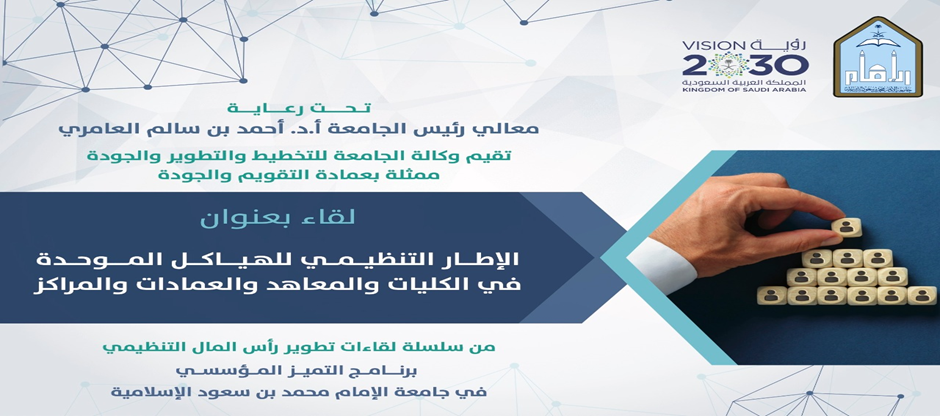 Imam Mohammed bin Saud Islamic university believes in its mission to achieve excellence, and strives consistently to achieve this by adopting the best policies and practices to ensure the quality of higher education institutions, and the pillar of evaluation and quality comes as one of the most important support pillars concerned with achieving the university's strategic orientations towards quality and excellence of performance.