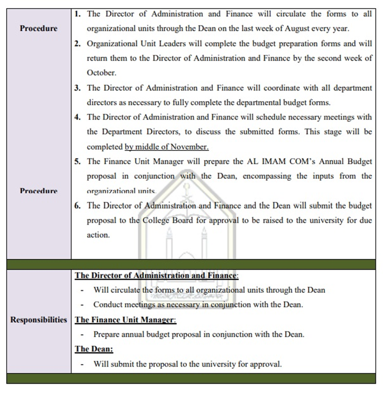 Preparing the draft annual budget for the center's events, in preparation for its presentation to the center's board, and then submitting it to the university's competent authority.
