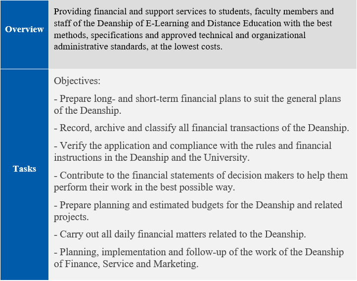 It is linked to the Dean of Student Affairs, and aims to provide all financial and accounting services in the Deanship in accordance with the laws, regulations and instructions.