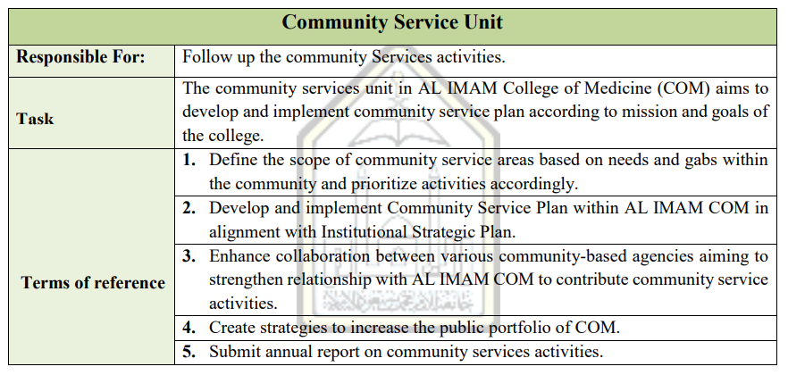 The vision, mission and objectives of the community service unit are based on the college's mission: