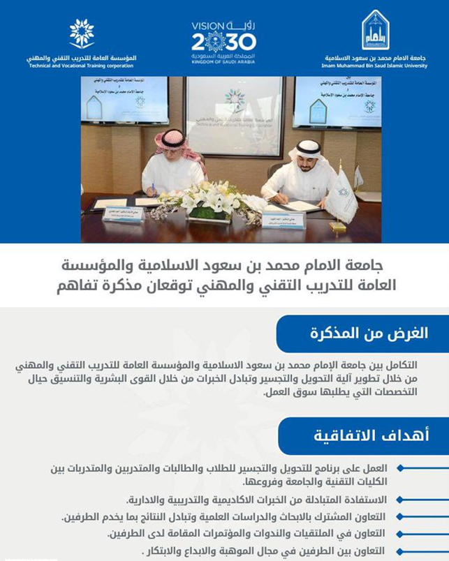 The General Organization for Technical and Vocational Training and the Imam Muhammad bin Saud Islamic University today signed a memorandum of understanding to enhance cooperation in various fields, where the memorandum of understanding was signed by His Excellency the Governor of the Technical and Vocational Training Corporation, Dr. Imam Muhammad bin Saud Islamic University, Dr. Ahmed bin Salem Al Ameri.
