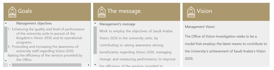 The Office strives with all its potential to achieve the high aspirations of the university's employees and employees to achieve the Kingdom's Vision 2030, to engage hard and strive to implement the objectives of the high executive vision programs in a positive and optimistic spirit.