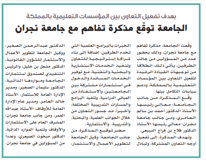 The Vice Rector for Knowledge Exchange and International Communication praised the support and interest of His Excellency the President of the University, a member of the Council of Senior Scholars, Professor Dr. Sulaiman bin Abdullah Aba Al-Khail, to activate the terms of this memorandum, pointing out that what the university has reached in terms of a prestigious and advanced position among Saudi and international universities came thanks to God and then thanks The directives of His Excellency the Rector of the University in light of the support and support that the University enjoys from the guardians under the leadership of the Custodian of the Two Holy Mosques King Salman bin Abdulaziz and His Highness the Crown Prince, Prince Muhammad bin Salman bin Abdulaziz - may God preserve them.