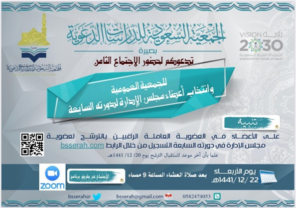 The Saudi Scientific Society for Advocacy Studies "Baseera" will hold its eighth general assembly meeting next Wednesday evening, 22 Dhul-Hijjah via video broadcast.