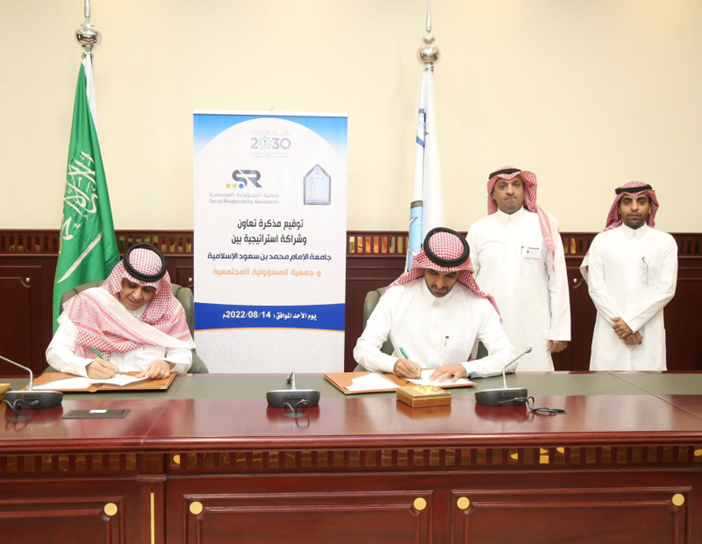 Al-Imam Muhammad bin Saud Islamic University signed a memorandum of cooperation with the Society for Social Responsibility, where the memorandum was signed by the university's Vice Rector for Knowledge Exchange and International Communication, Dr. Abdullah Al-Shiddi, and by the association, Mr. Abdullah bin Sulaiman Al-Muhanna.