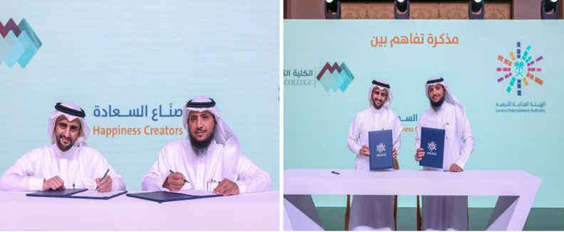 The Applied College at Imam Muhammad bin Saud Islamic University signed a memorandum of understanding with the General Entertainment Authority recently at the Four Seasons Hotel in Riyadh, and the university was represented at the signing ceremony by Dr. Abdullah bin Ibrahim Al-Salloum, CEO of the College, and the Authority was represented by its CEO, Eng. Faisal bin Saeed Bafarat.