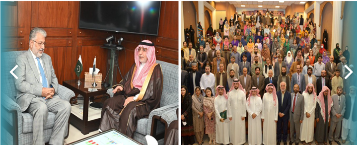 At the end of his visit today to the Islamic Republic of Pakistan, His Excellency the President of the University, Prof. Al-Ameri, expressed his sincere thanks, appreciation and gratitude to the Ambassador of the Custodian of the Two Holy Mosques in the Republic of Pakistan, Mr. Nawaf Al-Maliki, appreciating His Excellency for the good reception, hospitality and distinguished coordination in the delegation's visits with Pakistani officials, which included His Excellency's meeting with His Excellency the President of Islamic Pakistan, the Supreme President of the International Islamic University, Prof. Dr. Arif Alvi, His Excellency the Minister of Federal and Vocational Education, Mr. Medad Ali Al-Sindi, and His Excellency the President of the Supreme Court, Judge Fayez Issa, and His Excellency the President of the Higher Education Authority, Dr. Mukhtar Ahmed.