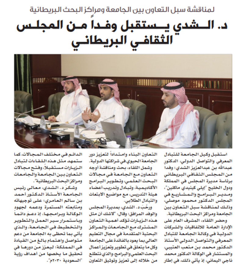 The meeting was attended by the Vice Dean for Knowledge Exchange and International Communication, Prof. Abdullah Al-Yousef, the Dean of Admission and Registration, Dr. Suleiman Al-Anqari, and the Director of the International Cooperation Department, Dr. Muhammad Al-Otaibi, in addition to a number of university leaders.