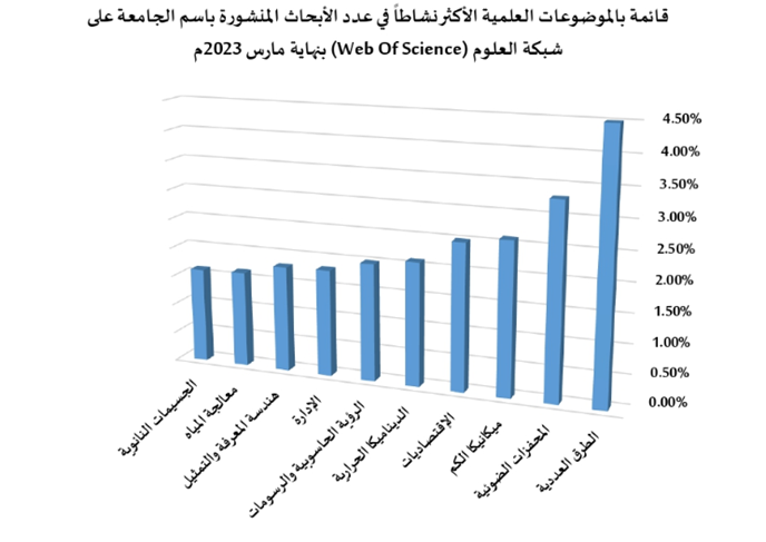 Dr. Al-Yami explained that the university confirmed the continuation of its research excellence in topics such as economics and management, which constitute 4.32% of the total research published in the name of the university on the network of sciences, while research in the field of numerical methods topped the most active topics in the name of the university by 4.5% of the total research published on the network, which is a cornerstone for many sciences in the fields of engineering and computer science, and Dr. Al-Yami said that this field was adopted in the twenty-first century. By natural scientists, social sciences and medicine, the growth of computing power has revolutionized the use of numerical analysis and realistic mathematical models in various fields of science.