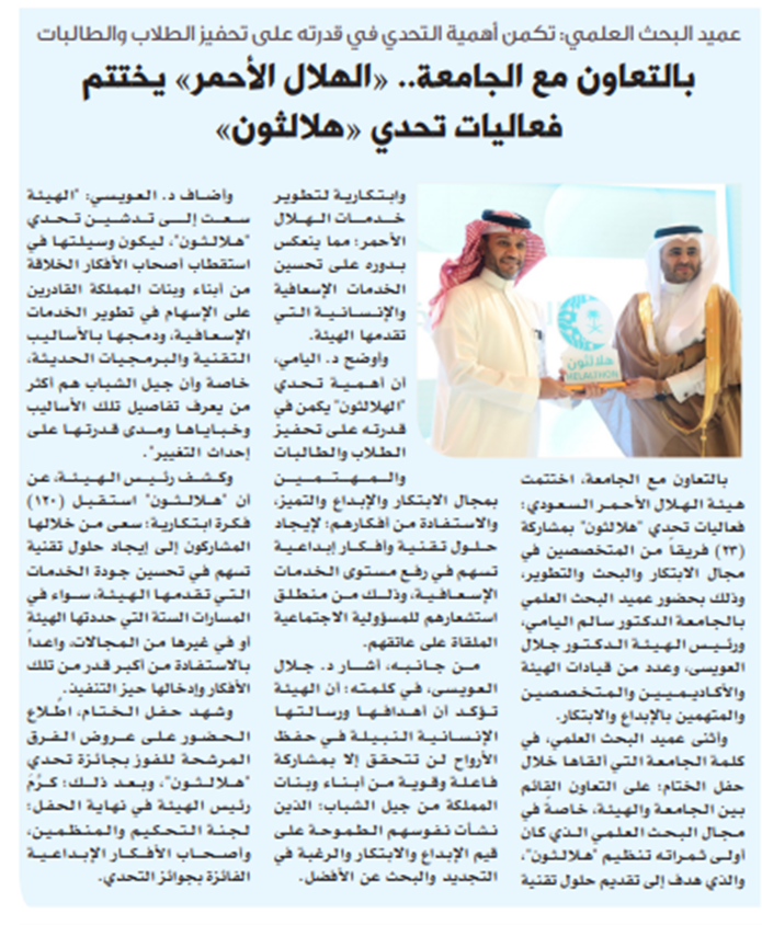 Today, the Saudi Red Crescent Authority, in cooperation with Imam Muhammad bin Saud Islamic University, launched the two-day Crescent Challenge, with the participation of a number of parties, with the aim of supporting innovation, developing and improving ambulance services in the Kingdom.