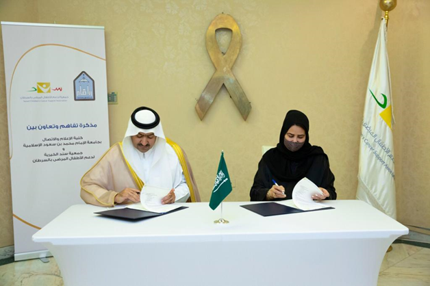 With the support of His Excellency the President of the University, Prof. Dr. Ahmed bin Salem Al-Amiri, Imam Muhammad bin Saud Islamic University, represented by the College of Information and Communication, signed on Wednesday 16/9/1442 AH a memorandum of understanding with the Sanad Charitable Society to support children with cancer. The memorandum comes within the framework of responsibility The college’s social and desire to support charitable and humanitarian institutions in the community in a way that achieves the common interest for the advancement of the nation and the service of its citizens and residents on its land.