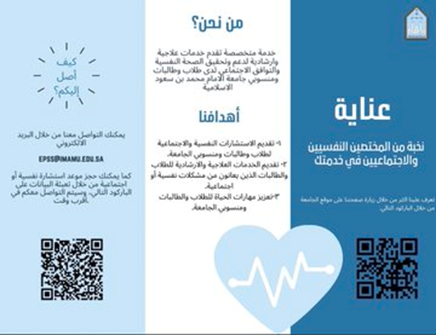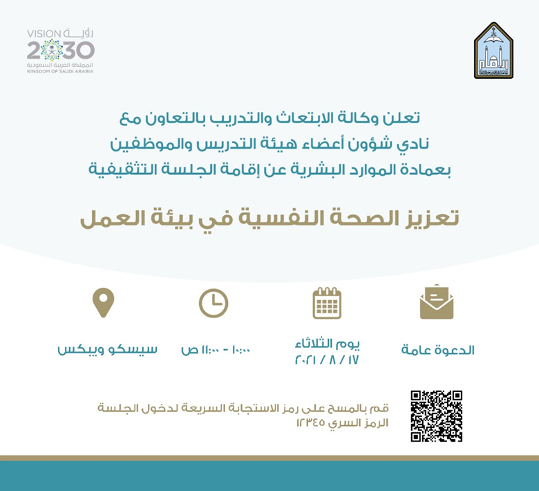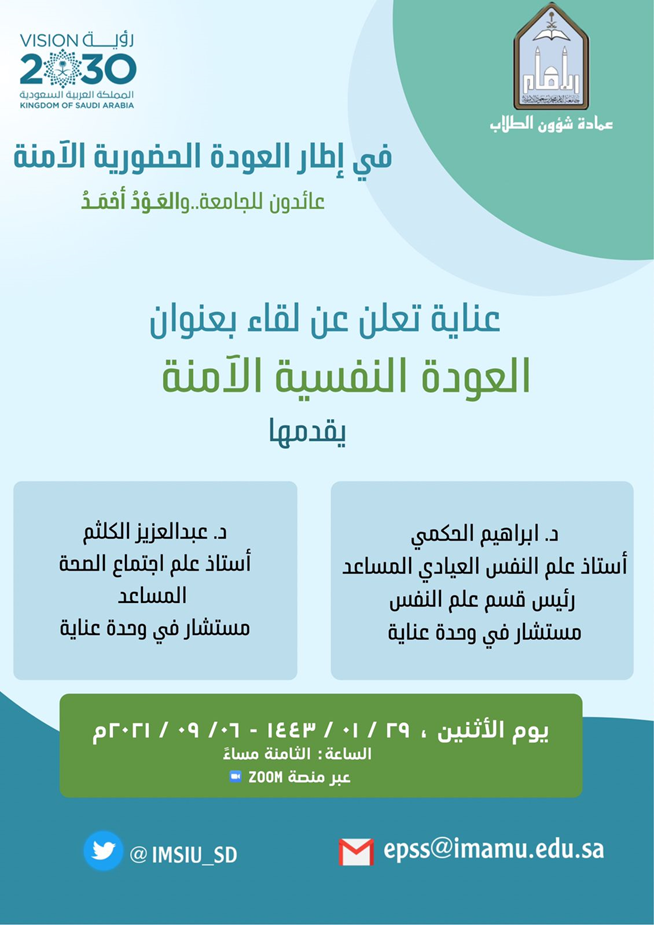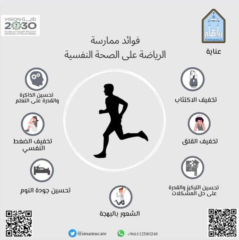 Not to mention the presence of a number of hospitals specialized in mental health, and scientific departments in universities, and the National Center for Mental Health Promotion bears witness to the state's interest in this aspect. At Al-Imam University, we have a permanent committee - with experience and expertise - to promote the mental health of university and community employees, in addition to what is provided in this field through the College of Medicine and the University’s Medical Services Center, asking my sons and daughters (students) and university employees to benefit and benefit from these services. Wishing everyone a happy healthy life.