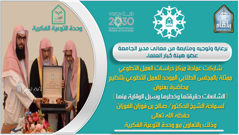 Under the patronage and guidance of His Excellency the University President, the Deanship of the Center for Voluntary Work Studies, represented by the Unified Student Council for Voluntary Work, participated in organizing a lecture entitled: (Rumors are their truth, danger and ways to prevent them) for His Eminence Sheikh Dr. Saleh bin Fawzan Al-Fawzan.