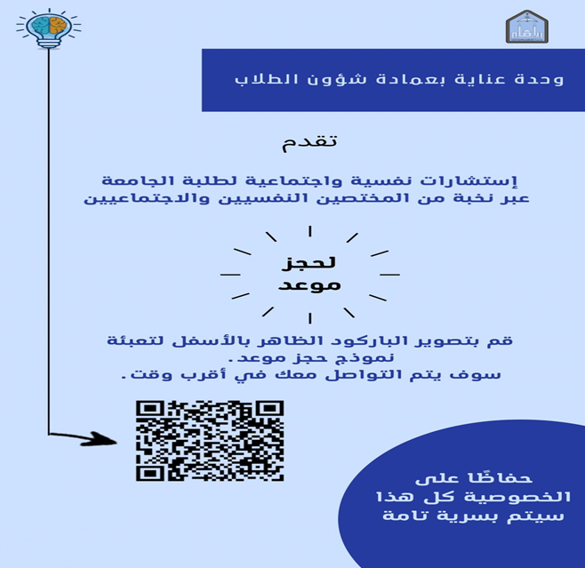 We are pleased at #عناية to announce the provision of psychological and social counseling and therapy sessions for university students and employees (remotely), to book an appointment, please fill in the data on the following link, and we will contact you as soon as possible.