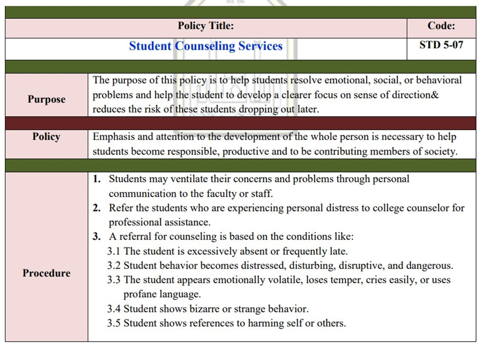 Academic guidance committee should discus all reports of psychologically ill students and approved a final report that include full assessment and sufficient follow up including action plans.