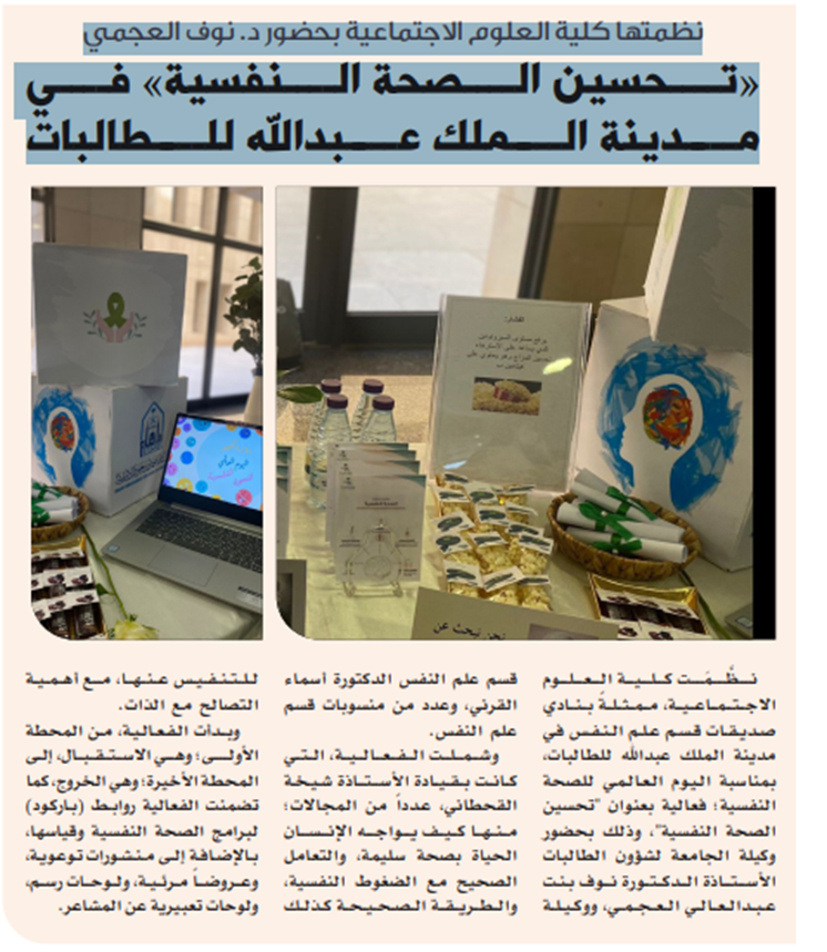 The Dean of the College of Social Sciences indicated that the Kingdom of Saudi Arabia pays great attention to the World Mental Health Day and promoting awareness of it in society and at the national level, as the Kingdom has witnessed a remarkable development in the field of mental health in recent years, as the Kingdom of Saudi Arabia has taken several measures to promote mental health and support individuals with mental health problems. The mental healthcare infrastructure in the Kingdom has been developed, including the provision of health facilities, psychiatric clinics and specialized hospitals. Training and qualification of mental health cadres to provide professional and specialized services has also been strengthened, in addition to implementing awareness and educational campaigns targeting the community in general, with the aim of raising awareness of the importance of mental health and reducing the stigma associated with it. Events, awareness lectures and workshops have been organized to enhance knowledge and understanding about mental health, and the Saudi government is also adopting national policies and plans to promote mental health and improve health care in this area, paying special attention to vulnerable and needy groups such as children, adolescents, the elderly and people with special needs, and working to provide them with appropriate support and care.