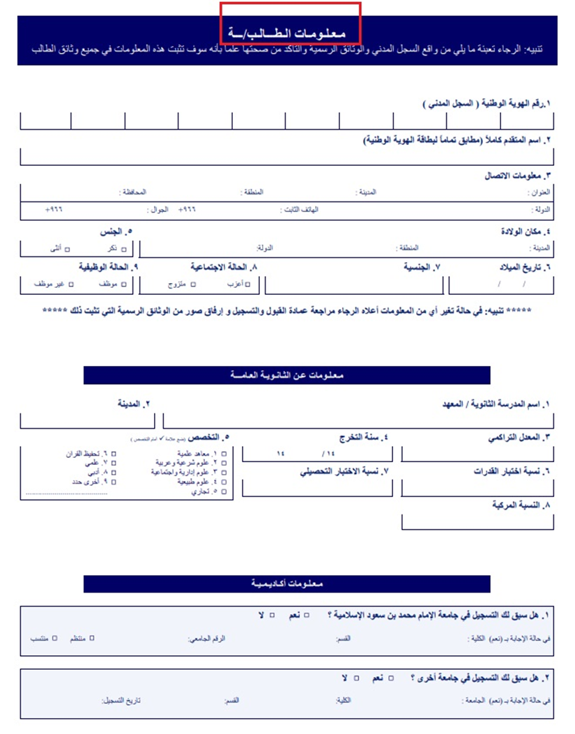Therefore, some scientific departments require additional special conditions for admission to their programs, such as: determining the specializations required for admission, requiring supplementary courses, memorizing parts of the Holy Quran, or English, or determining a score to test the abilities of university students, among others.