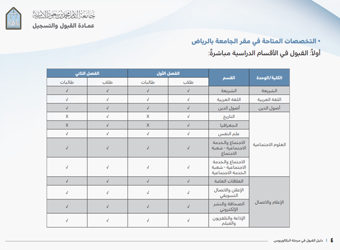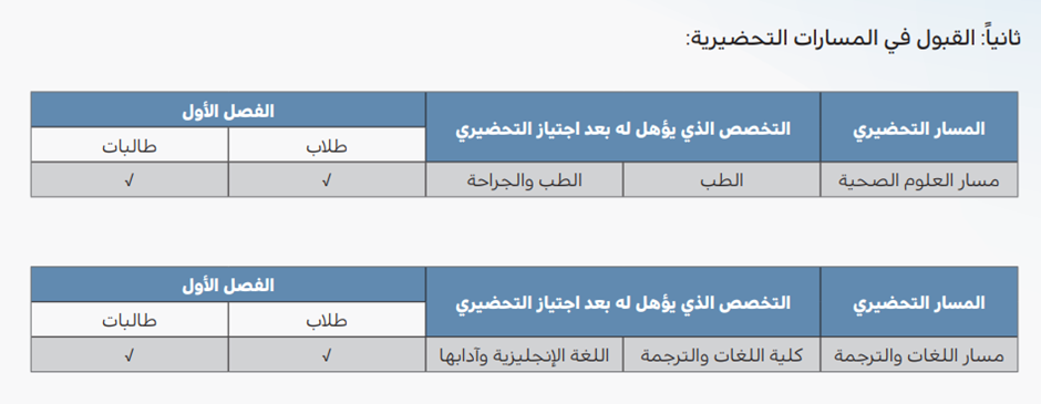 It is a university education in which admission is once on summer leave, through the unified admission portal at public universities in Riyadh. Accordingly, the student is accepted directly into the scientific department he wishes to join after successfully passing the preparatory program. The study is regular and requires attendance and the approval of the employer if the applicant is on the job, and the graduate is awarded a bachelor's degree.