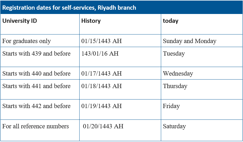 For the first semester of the academic year 1443 AH, through self-services, starting from Sunday, 01/14/1443 AH , at eight in the morning for male students , at twelve in the afternoon for female students , and at six in the evening for male and female students of Al-Ahsa branch , and continues until Saturday, corresponding to 01/1443 20 AH .