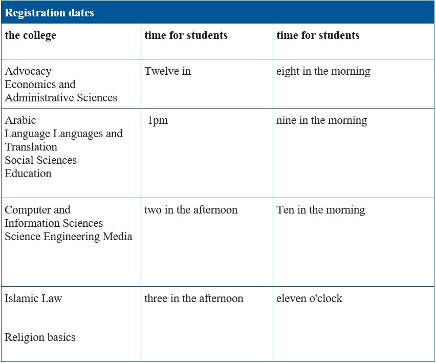 The Deanship of Admission and Registration announces the start of registration of courses for students of regularity for the first semester of the academic year 1444 AH, through self-services starting from Sunday 02-01-1444 AH corresponding to 31-07-2022 AD at 8 am for students, and at 12 pm for female students, and continues until Saturday 8-01-1444 AH corresponding to 06/08/2022 AD.