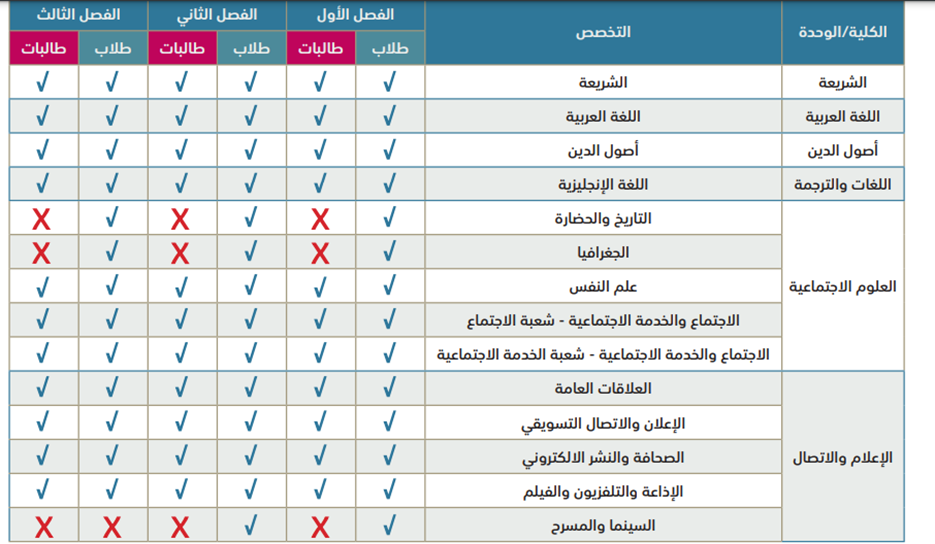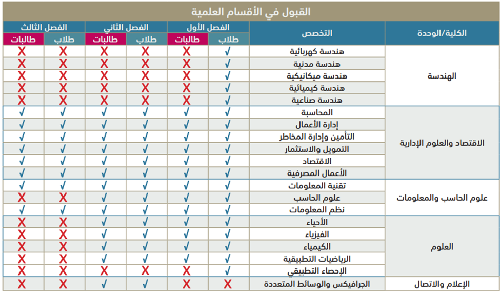 It is a university education in which admission is once on summer leave, through the unified admission portal at public universities in Riyadh. Accordingly, the student is accepted directly into the scientific department he wishes to join after successfully passing the preparatory program. The study is regular and requires attendance and the approval of the employer if the applicant is on the job, and the graduate is awarded a bachelor's degree.