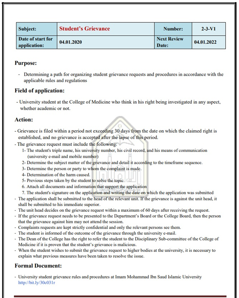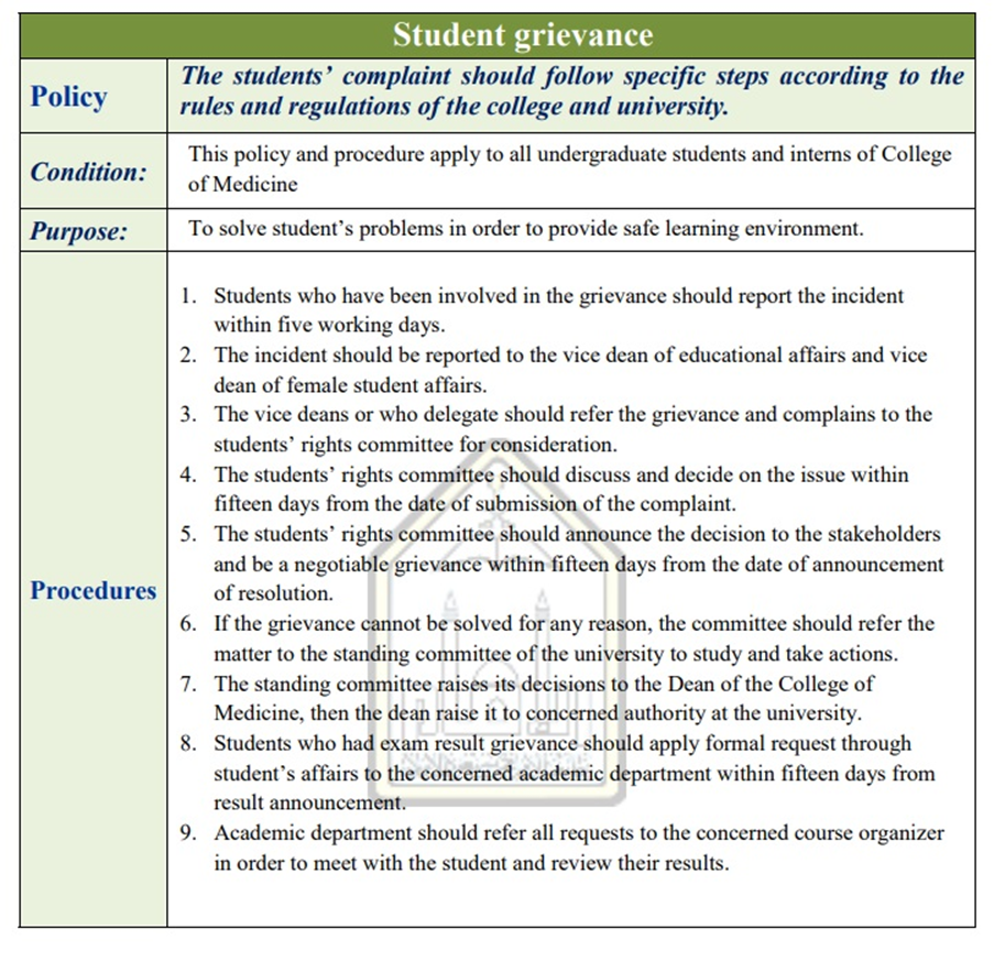 The purpose of student grievance policy is to provide guidance and procedures for addressing student grievances and complaints in an equitable manner in order to reach fair and appropriate resolution to student complaints in compliance with Al Imam COM standards for the process.