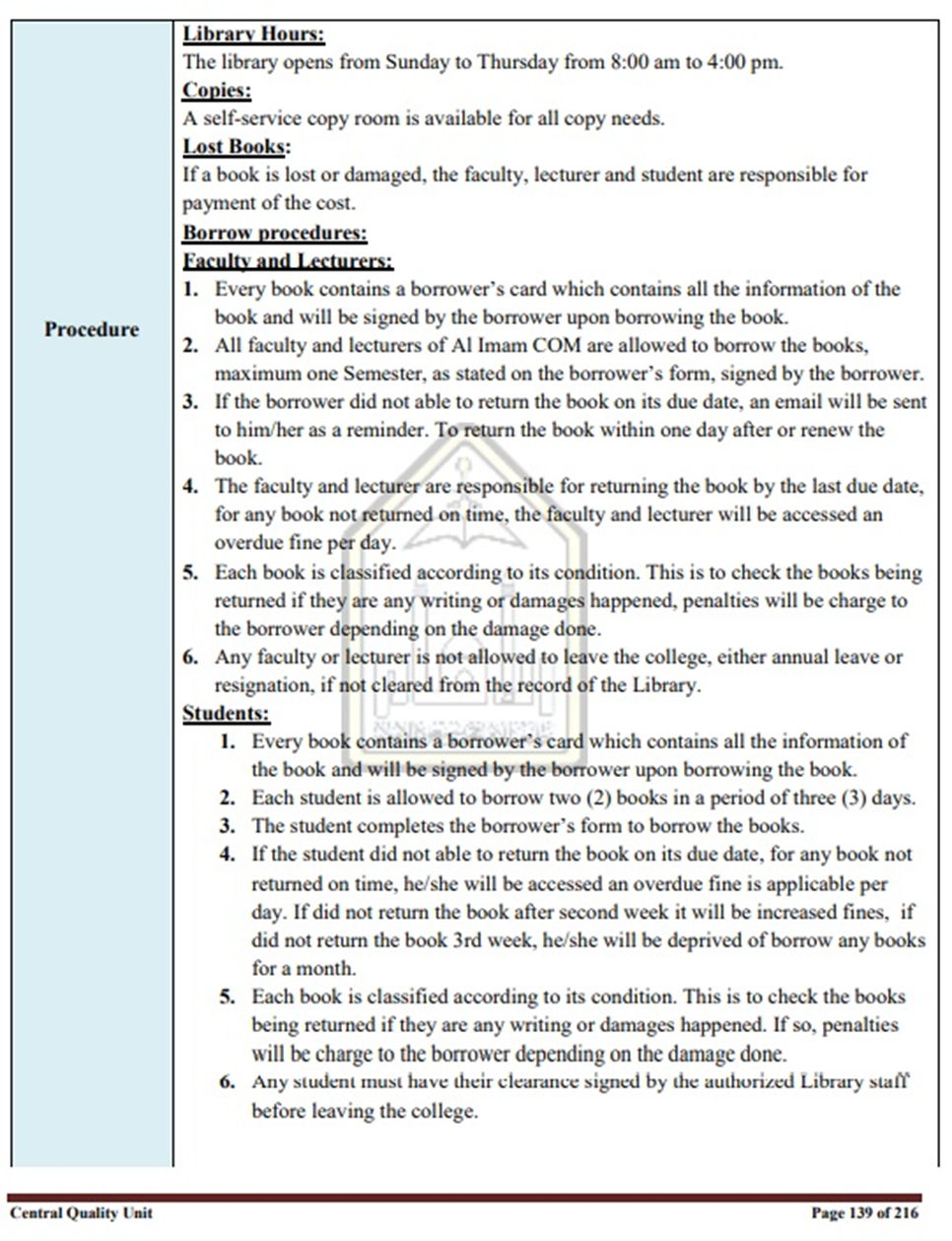 The library is equipped with easy-to-use and cost-effective copying machines, in addition to the availability of adequate facilities for the use of portable PCs. IMSIU evaluates periodically the services, facilities and resources and compares that with some other educational institutions of similar size and programs. The Deanship of Libraries Affairs and other units that have learning resources have a very clear set of policies and procedures for all its activities like evaluation and assessment of learning resources and facilities and making orders for new books and scientific references, renewing and placing new orders for online international digital libraries, periodical subscriptions, other scientific database subscriptions, and renewing and maintaining equipment.
